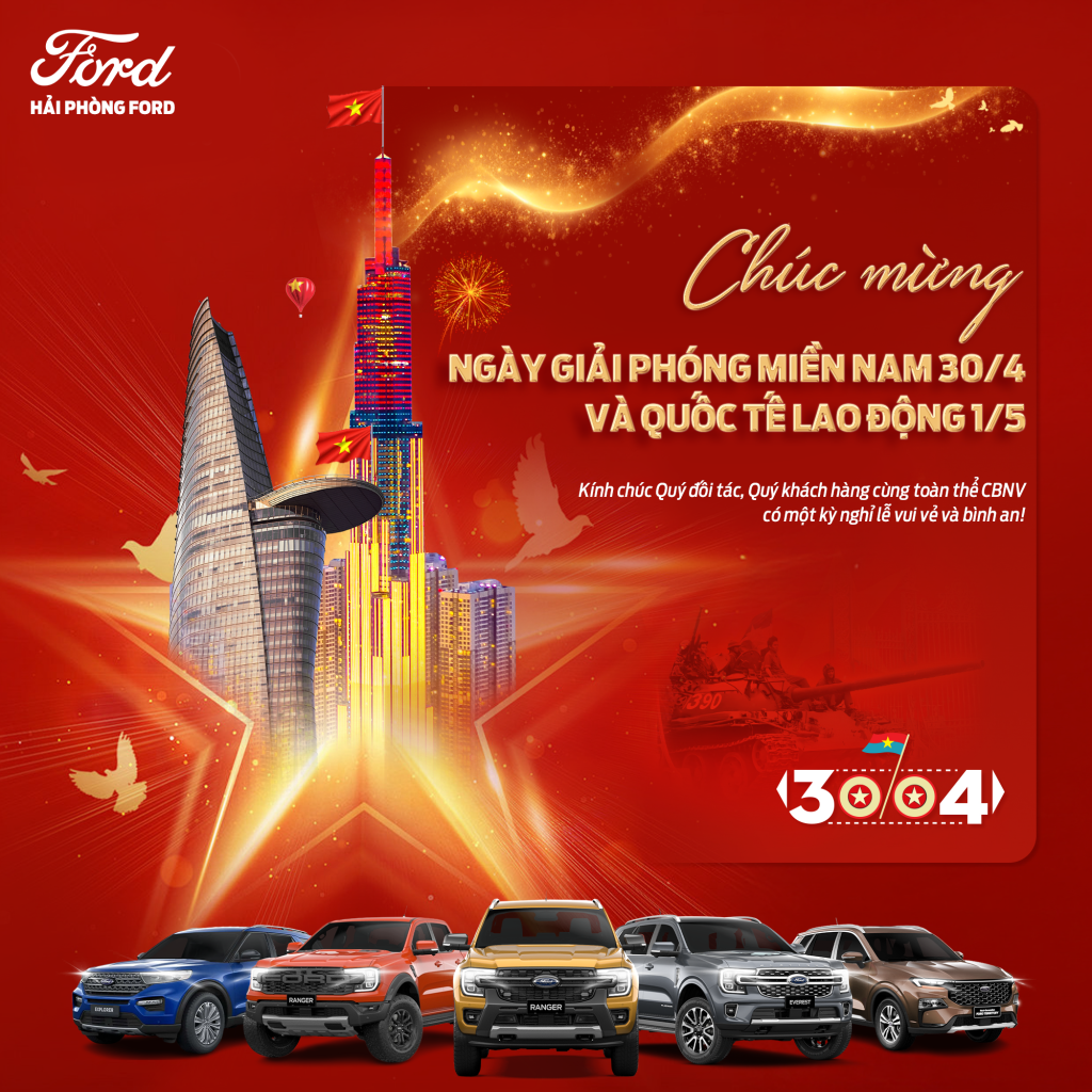 Nhân dịp kỷ niệm 50 năm Ngày Giải phóng miền Nam và Quốc tế Lao động, Hải Phòng Ford xin kính chúc quý khách hàng, quý đối tác và toàn thể cán bộ nhân viên có một kỳ nghỉ lễ bình an, nhiều niềm vui và thật nhiều ý nghĩa bên những người thân yêu.