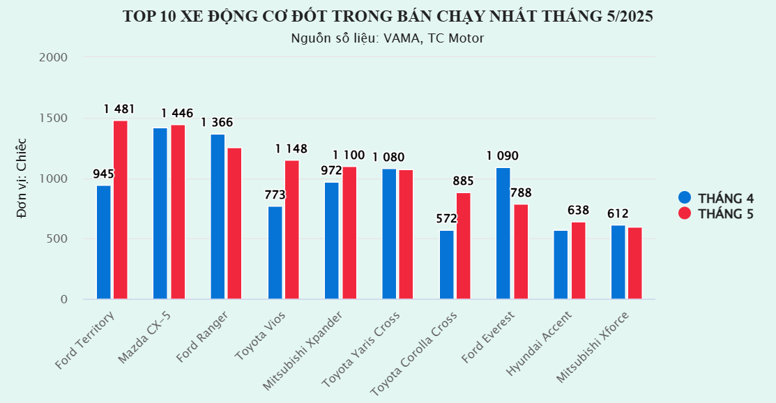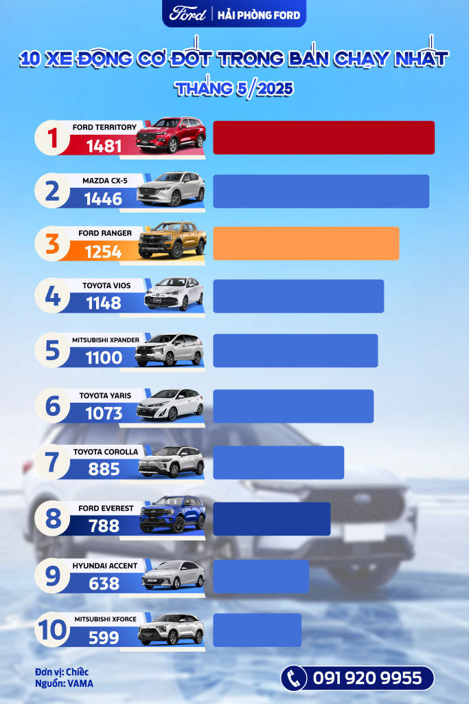 Thị trường ô tô Việt Nam tháng 5/2025 tiếp tục cho thấy sức hút mạnh mẽ từ các dòng xe sử dụng động cơ đốt trong, bất chấp sự trỗi dậy của làn sóng xe điện. Đáng chú ý nhất là sự bứt phá của Ford, khi mẫu Territory lần đầu tiên vươn lên vị trí dẫn đầu doanh số toàn thị trường, vượt qua đối thủ lâu năm Mazda CX-5.