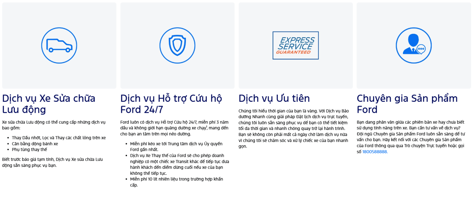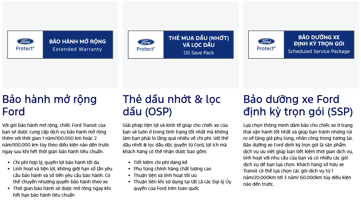 Ford Transit có Chi phí Chủ sở hữu sử dụng cạnh tranh so với các dòng xe khác trong phân khúc. Bảo dưỡng định kỳ giúp bạn lái xe an toàn, kéo dài tuổi thọ của xe và tiết kiệm nhiên liệu. Định kỳ Bảo dưỡng cho Transit là 10.000Km hoặc 6 tháng tùy điều kiện nào đến trước và Ford luôn đảm bảo chi phí Bảo dưỡng cạnh tranh nhất.